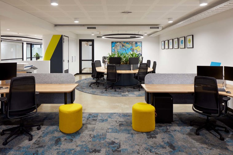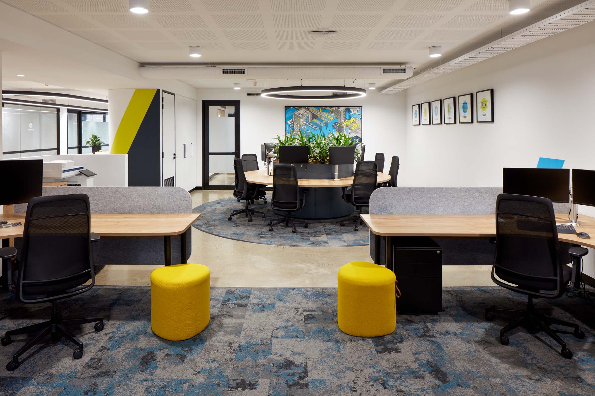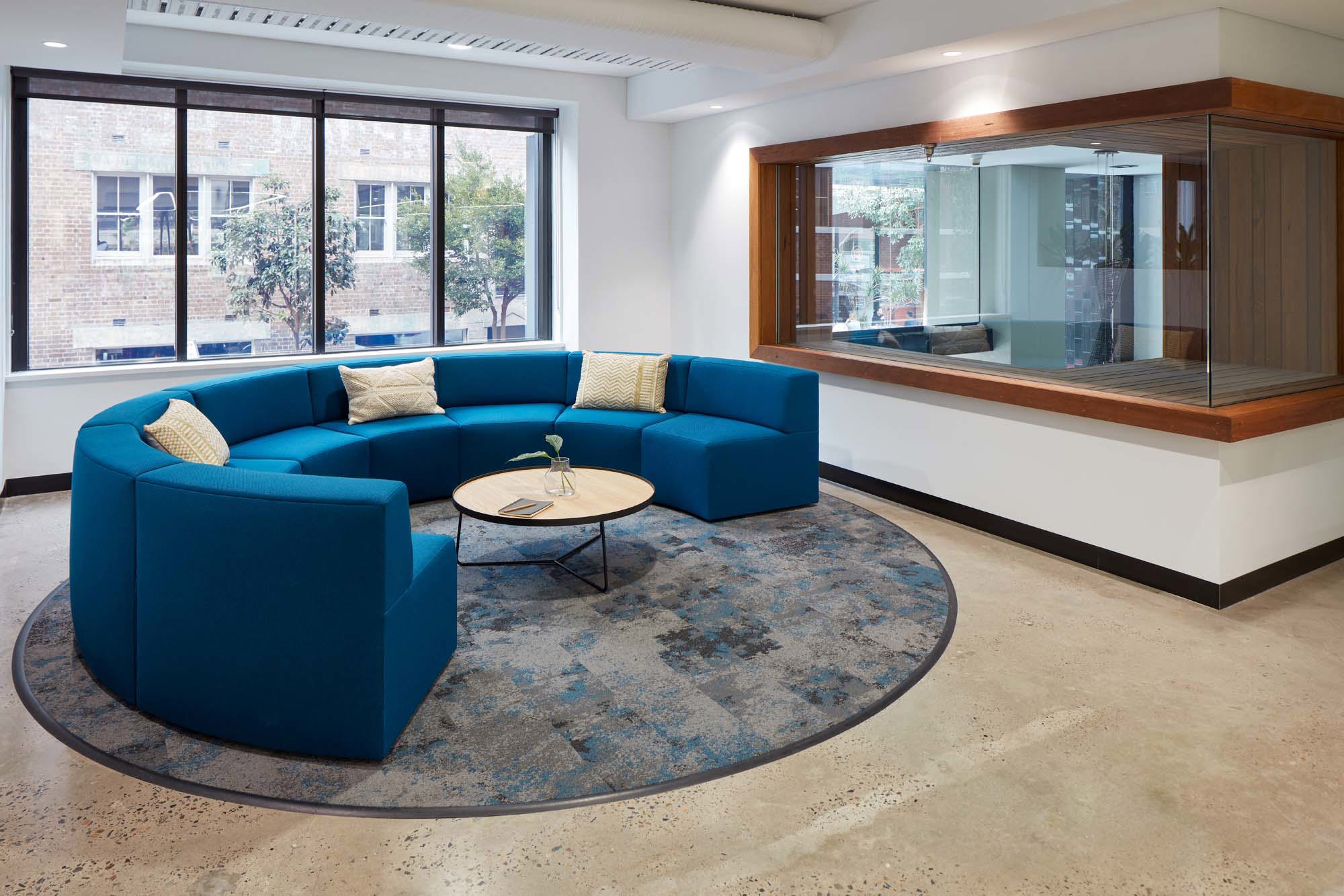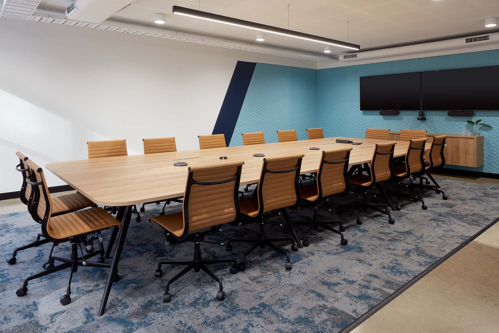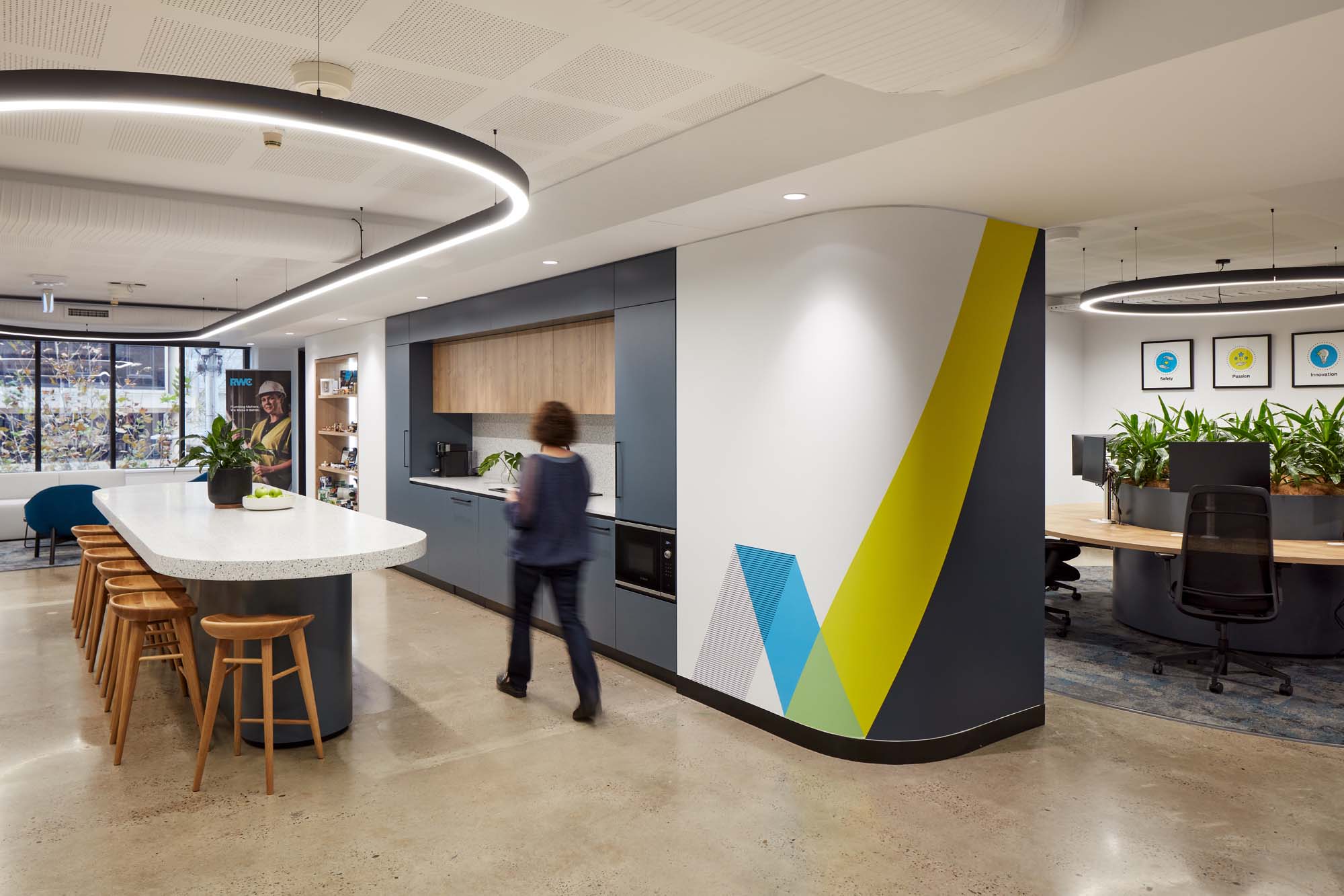 RWC’s brand identity seamlessly integrates into the office design, with the kitchen stone benchtop featuring varying shades of blue and timber elements in a deeper yellow, complementing the base building timber, all in line with RWC’s branding guidelines and palette. Acoustic panelling in the meeting rooms reflects RWC’s distinctive two-tone logo elements.